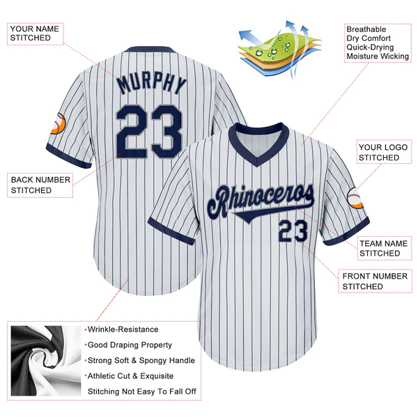 Custom White Navy Pinstripe Navy-Gray Authentic Throwback Rib-Knit Baseball Jersey Shirt